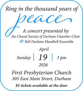 The concert will include selections by each group and joint performances. The theme for the concert is “Ring In the Thousand Years of Peace,” a line from the poem “Ring Out, Wild Bells” by Alfred Lord Tennyson. The two ensembles will perform a piece by Daniel E. Gawthrop named for the poem, which uses the imagery of church bells to call for ringing in a new year filled with truth, love and peace. Another highlight of the repertoire is “The Bells,” a musical setting of the Edgar Allen Poe poem for handbells and chorus by David York. The piece evokes the changing stages of life – from joyous wedding bells to mournful funeral tolls. Selections performed by Bell Durham will include three new arrangements by Mitchell Eithun, the group’s artistic director. The first, “Total Praise,” is a handbell version of the popular composition by Richard Smallwood, the well-known gospel artist who died in December. The second, “What the World Needs Now Is Love,” captures the 1965 Burt Bacharach hit recorded by Jackie DeShannon. The third, “I Dream a World,” is based on the celebrated Langston Hughes poem and the choral music of André J. Thomas. Members of the Chamber Choir will join Bell Durham on “I Dream a World.” Tickets are $5 at the door and all payment types are accepted. This project was supported by the Durham Arts Council’s Annual Arts Fund and the North Carolina Arts Council, a division of the Department of Natural & Cultural Resources. Bell Durham is Durham’s first community handbell ensemble. Using six octaves of handbells, handchimes, and various other instruments, the ensemble plays advanced music from around the world and across the musical spectrum including traditional handbell music, classical music arranged for handbells, pieces by modern handbell composers, and seasonal classics with a handbell twist. The Choral Society of Durham Chamber Choir is a select 30-36 voice ensemble drawn from the main choir. Members are selected by audition from throughout the Triangle area. For more information, visit our website (https://belldurham.org/) or email us (ring@belldurham.org).